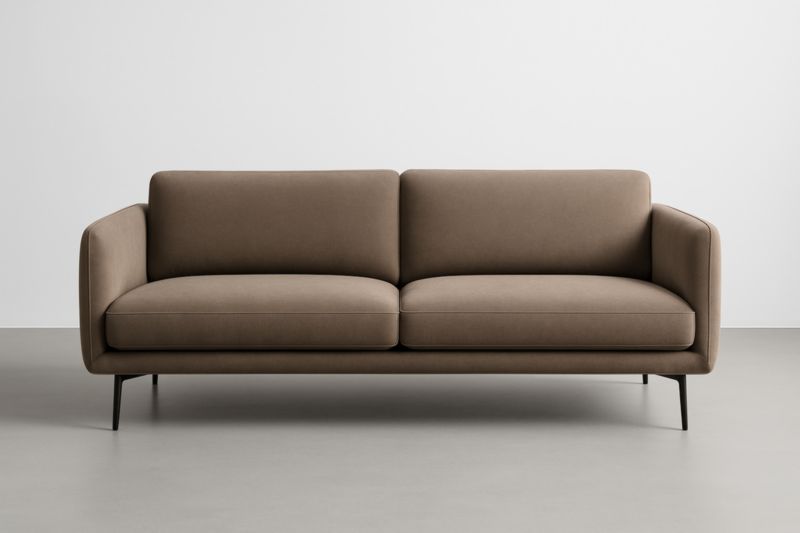Divano due posti in tessuto marrone con gambe in metallo, dimensioni 200 x 85 x 75 cm